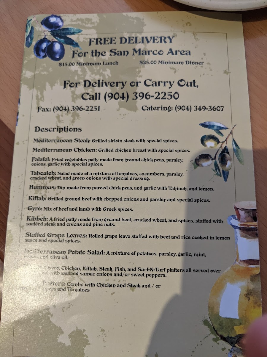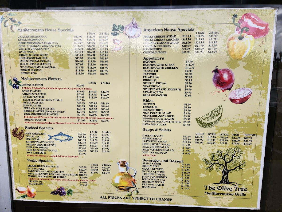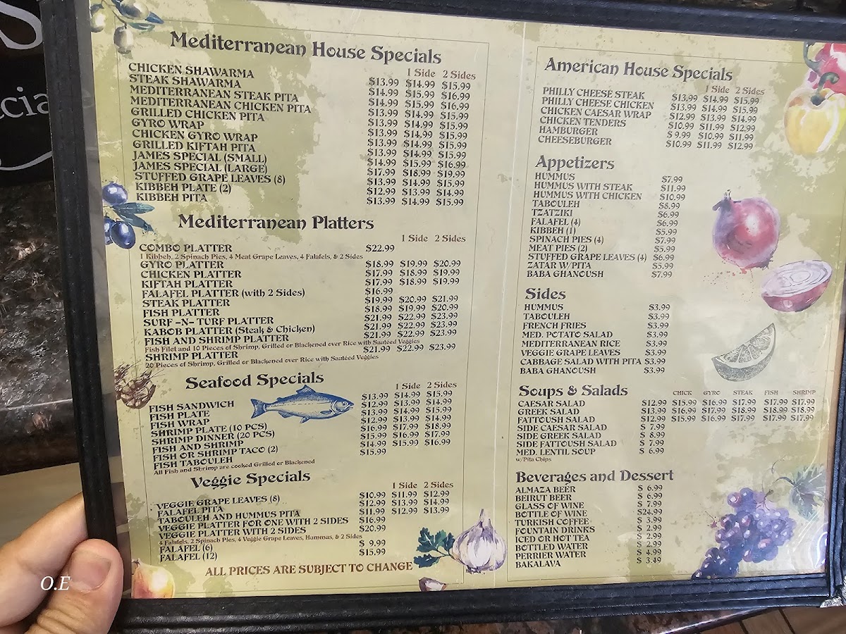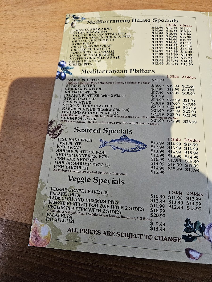 Fish and shrimp paired with a choice of side: hummus, fries, potato salad, rice, grape leaves, cabbage salad, or baba ganoush. Mediterranean flavors.