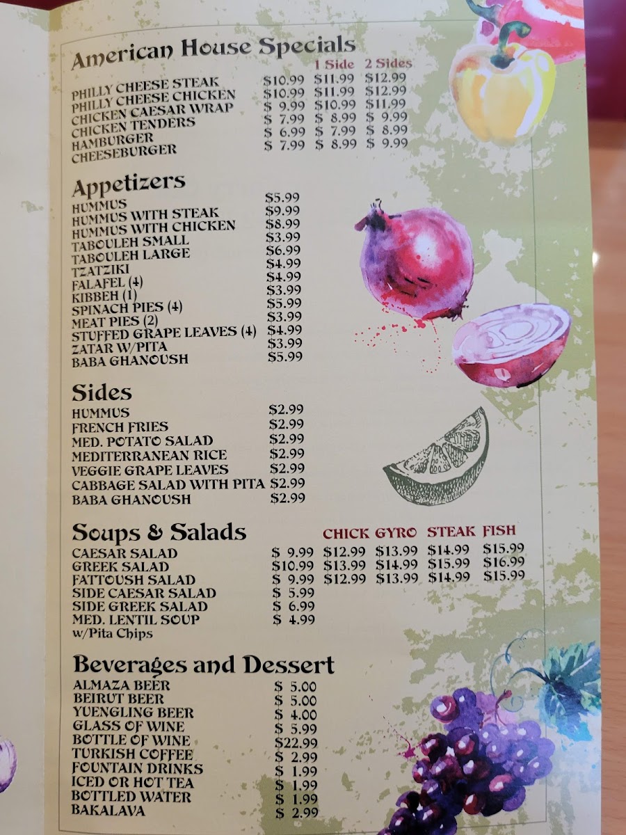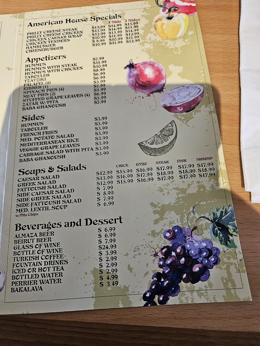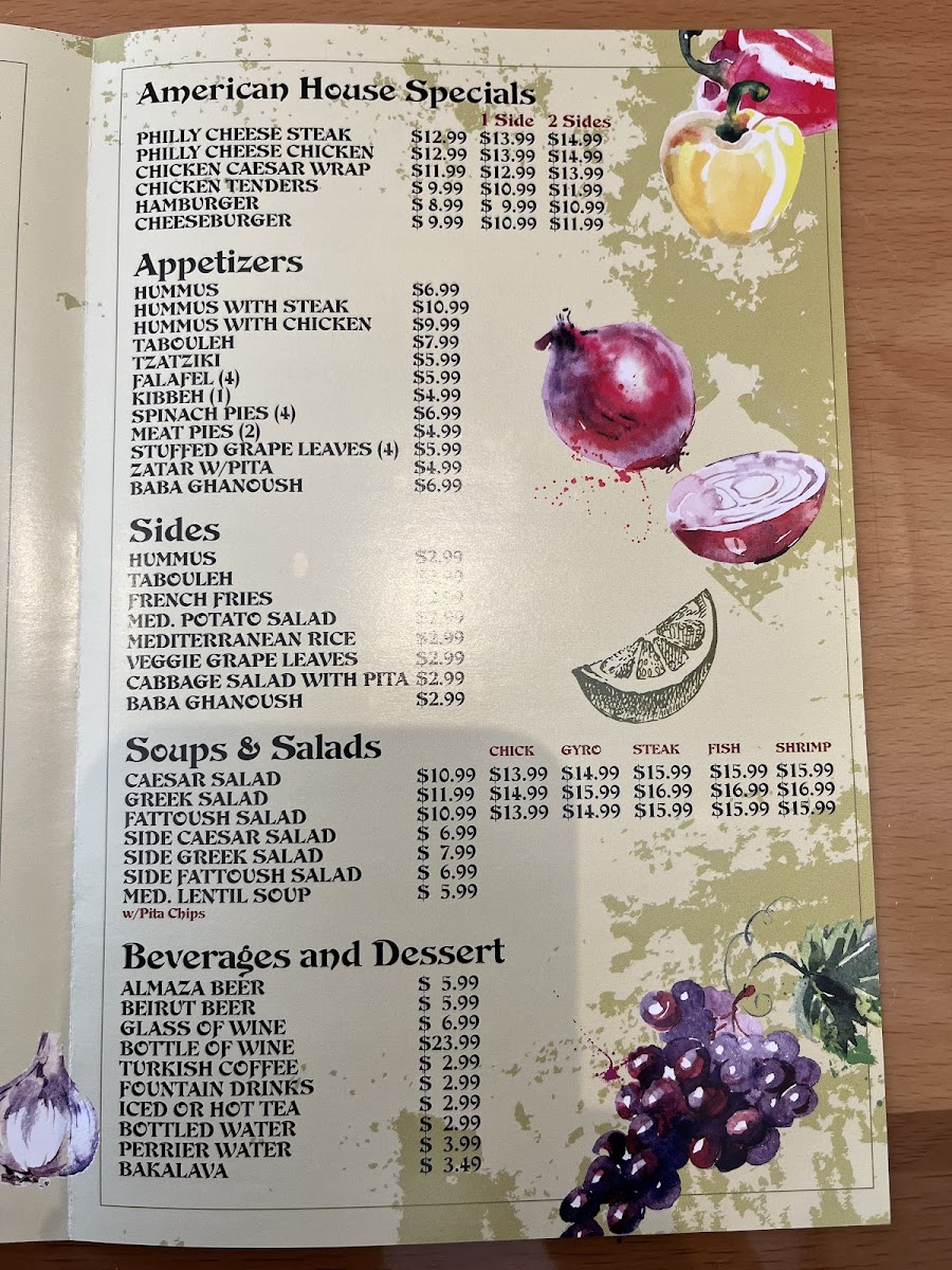 Steak paired with seafood. Choose two sides: hummus, french fries, salads, baba ganoush, or veggie grape leaves. Mediterranean flavors.