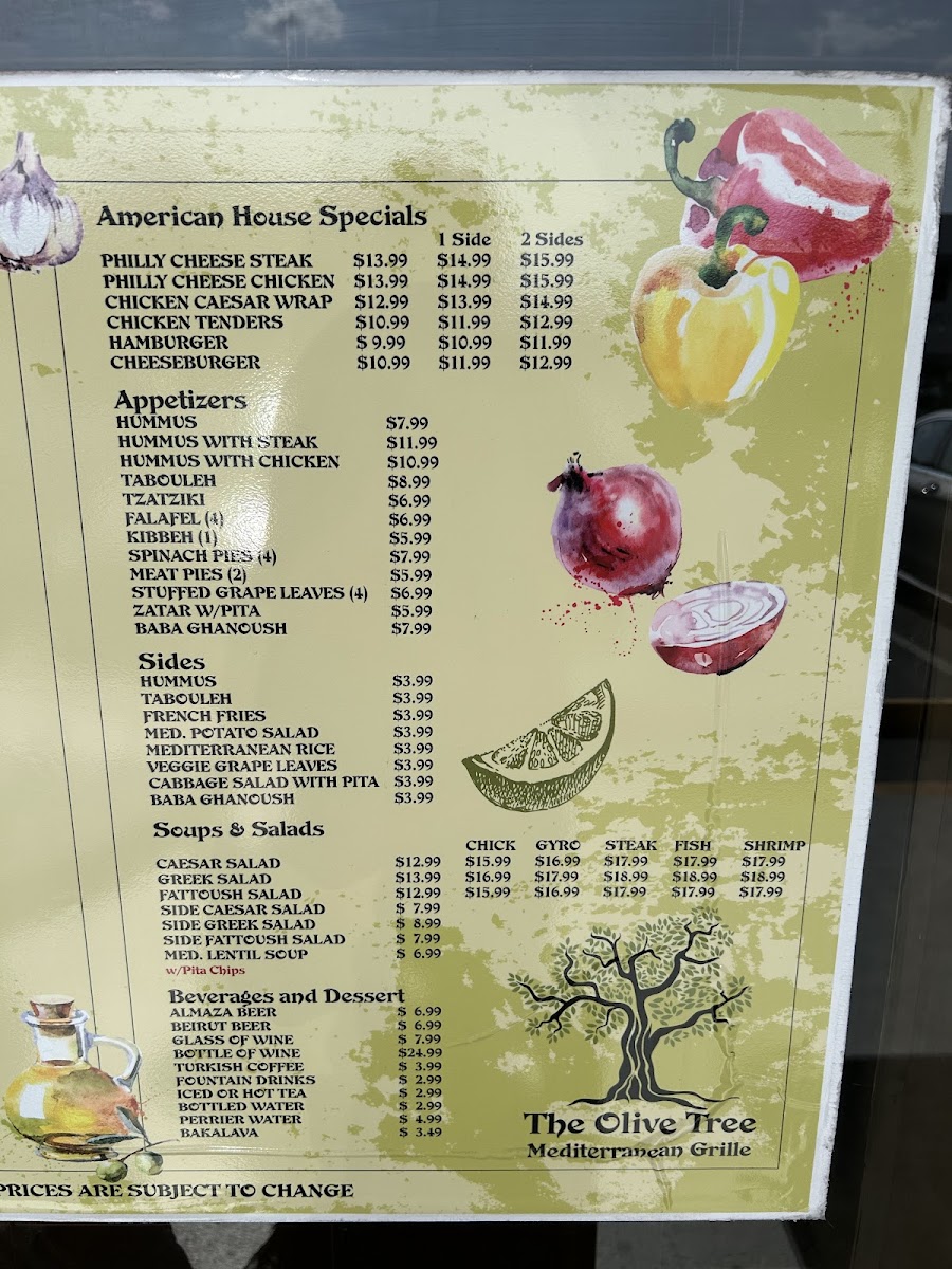 Fish & shrimp paired with two sides: select from hummus, french fries, Mediterranean potato salad, rice, veggie grape leaves, cabbage salad, baba ganoush.